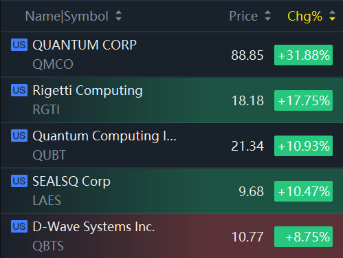 Quantum shares continued to rise on Friday. Quantum Corp up 32% after a 50% rally in prior session; Rigetti Computing up 18%; Quantum Computing Inc. up 11%; SEALSQ Corp up 10%; D-Wave Systems Inc. up 9%.