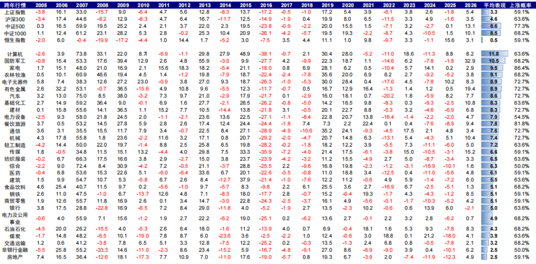 我们梳理了2005年至今的市场表现,首先选取每年12月上旬中央经济工作会议结束(约12月10日)至后一年“两会”结束(约3月5日)时点进行分析。我们发现,在这一固定时间区域内,所谓“春季躁动”行情的确十分明显,尤其在A股,且中小盘明显好于大盘,A股好于港股。以A股为例,在过去20多年的这一时间段内,A股大盘沪深300指数的平均涨幅在4.6%,上涨概率约64%。而中小盘中证500与中证1000指数的平均涨幅则分别到8.6%与8.5%,且上涨概率分别超过或接近70%。相反,港股市场受海外资金流动、美债利率等外部因素影响更大,在同期表现则相对平淡,虽然上涨概率约59%,但平均涨幅仅为0.5%。行业层面,A股计算机、军工与家电等板块表现最佳,平均涨幅在10%左右,相反地产、非银与交运等表现则相对落后,平均涨幅在2-3%。