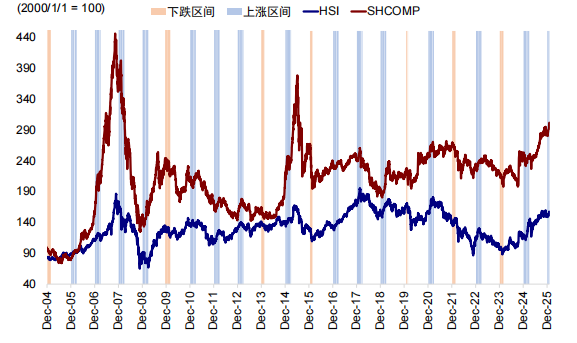 ► 信用周期下行和基本面疲弱更容易反映在港股。虽然A股与港股共享中国整体基本面,但宏观面变化对港股的影响往往更为显著。2025年四季度以来,信用周期再度下行,经济基本面走弱。港股中金融、地产等顺周期板块占比较高,即便是互联网和新消费也与基本面联系更紧密。相比之下,A股中科技硬件、制造业外需、PPI反内卷受益板块等支撑,盈利韧性更强,受基本面下行影响相对较小,还有资金和政策的呵护。其实,部分与基本面关联度更高的A股大盘指数,其涨幅与港股也更为一致,均明显弱于A股小盘股。