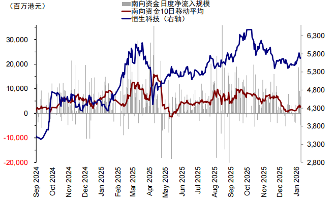 2026年开年以来,“春季躁动”的开门红如约而至,A股实现16连阳并创新高,但港股却明显“缺席”,除了元旦附近大涨两天,明显没有跟上A股的节奏,一些龙头个股甚至基本回吐了元旦期间的涨幅。在A股和港股走势明显脱节的背景下,南向资金也乏善可陈,甚至一度流出。实际上,港股从去年10月高点以来就一直偏弱,尤其是恒生科技指数在美、A、港三地主要指数中表现垫底,一度回调达20%。