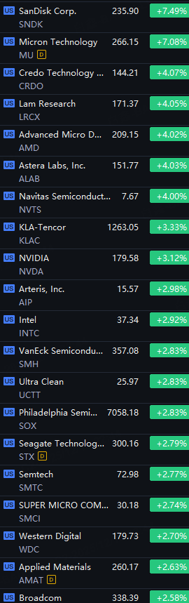Chip Stocks Kept Shining. Micron and SanDisk up 7%; Lam Research, AMD and Navitas up 4%; Nvidia and Intel up 3%; SMCI and Western Digital up 2%.