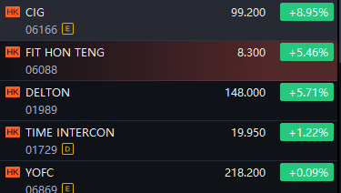 HK Optical Communication Stocks Jump. CIG up 9%; Delton and FIT Hon Teng up 5%; Time Intercon up 1%.