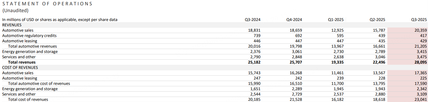 2025年三季度,特斯拉营收为281亿美元,同比增长12%,创下同期历史新高。然而,净利润为13.73亿美元,同比下降了37%,运营利润率仅5.8%,创近五年来最低,2024年同期还超过10%。此外,经调整净利润为17.7亿美元,同比下滑29%。