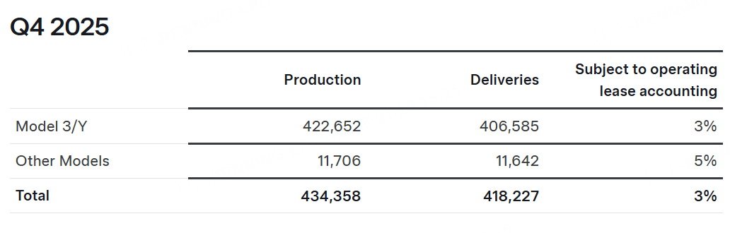 四季度,特斯拉交付了41.82万辆新车(包括交付40.66万辆Model Y和Model 3),同比下滑15.6%;而整个2025年,特斯拉全球交付汽车163.6万辆,同比下降约8.6%,连续两年销量下滑。这也是特斯拉有史以来首次在全年电动汽车销量上被比亚迪超越。
