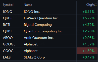 IONQ rose 6%; D-Wave Quantum, Rigetti Computing rose 5%; QUBT rose 3%; ARQQ rose 2%.