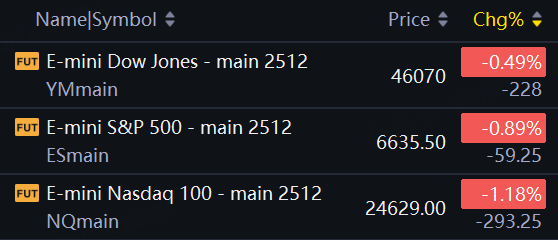 Big tech stocks fell in premarket trading. Micron down nearly 3%; Super Micro, Tesla, AMD, TSMC, Broadcom, Nvidia, Oracle down around 2%; Palantir, Meta down over 1%.