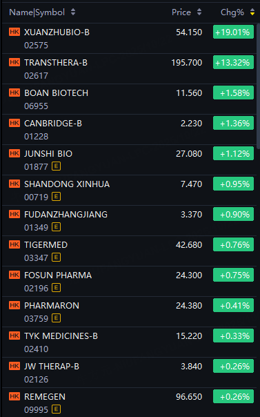 Xuanzhu Bio rose 19%; TransThera rose 13%; Boan Biotech rose 2%; CANbridge rose 1%.