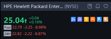 Shares of Hewlett Packard Enterprise were down about 9% in overnight trading after the company forecast annual profit and revenue below Wall Street expectations on Wednesday, as it shifts its server business toward artificial intelligence and networking following its Juniper Networks acquisition.