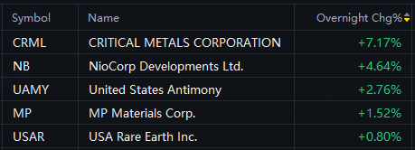Critical Metals rose 7%; NioCorp up 5%; United States Antimony rose 3%; MP Materials rose 2%; USA Rare Earth rose 1%.