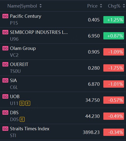 Singapore stocks opened lower on Monday. STI fell 0.34%; Pacific Century up 1.3%; Sembcorp Industries up 0.9%; SIA, OUEREIT, Olam Group down more than 1%.