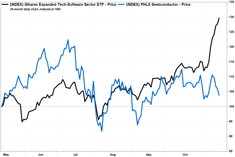 自美国大选以来, 费城半导体指数 (SOX)仅上涨了约2%,而北美软件ETF-iShares(IGV)则在七连涨的推动下上涨超过13%。同期,芯片股的表现也落后于标普500指数(SPX)的约5%涨幅。
