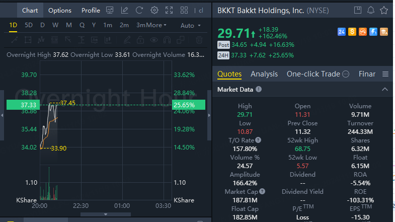 Bakkt gained 26% in overnight trading after soaring 162% in the previous trading day. Trump Media & Technology fell 3% in overnight trading.