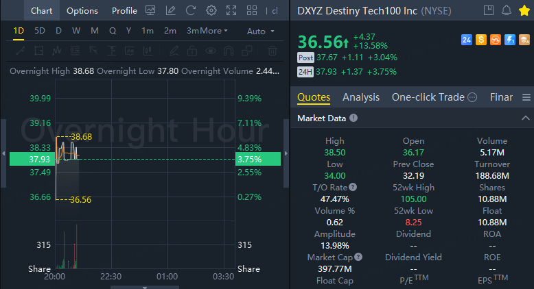 Destiny Tech100 Inc rose 4% in overnight trading.