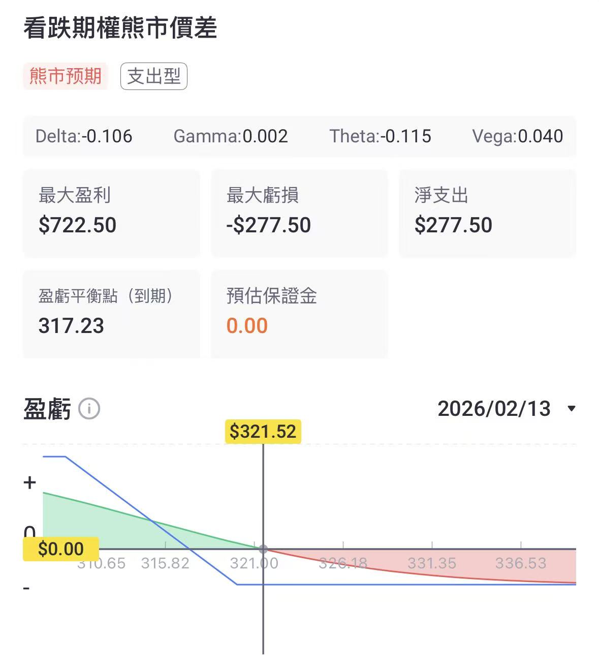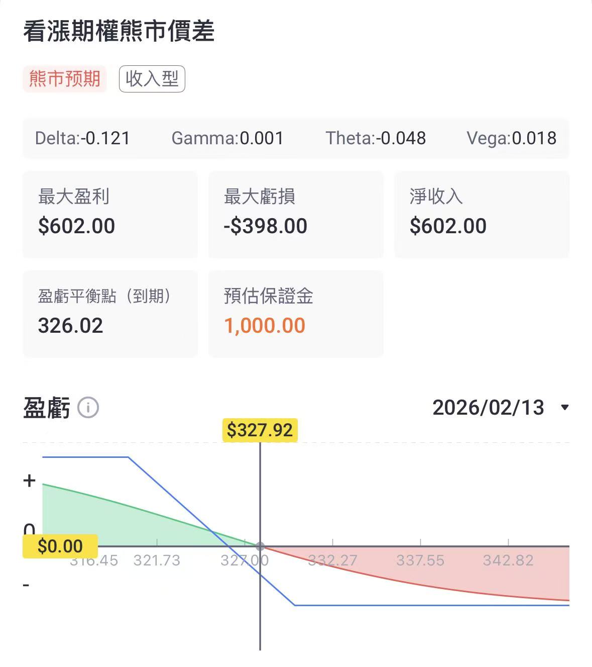 策略逻辑:该策略适用于预期股价将持稳或温和上涨的情景。通过卖出看跌期权收取权利金,并用买入更低行权价的看跌期权来对冲下行风险,在股价不跌破326美元时有望获利。