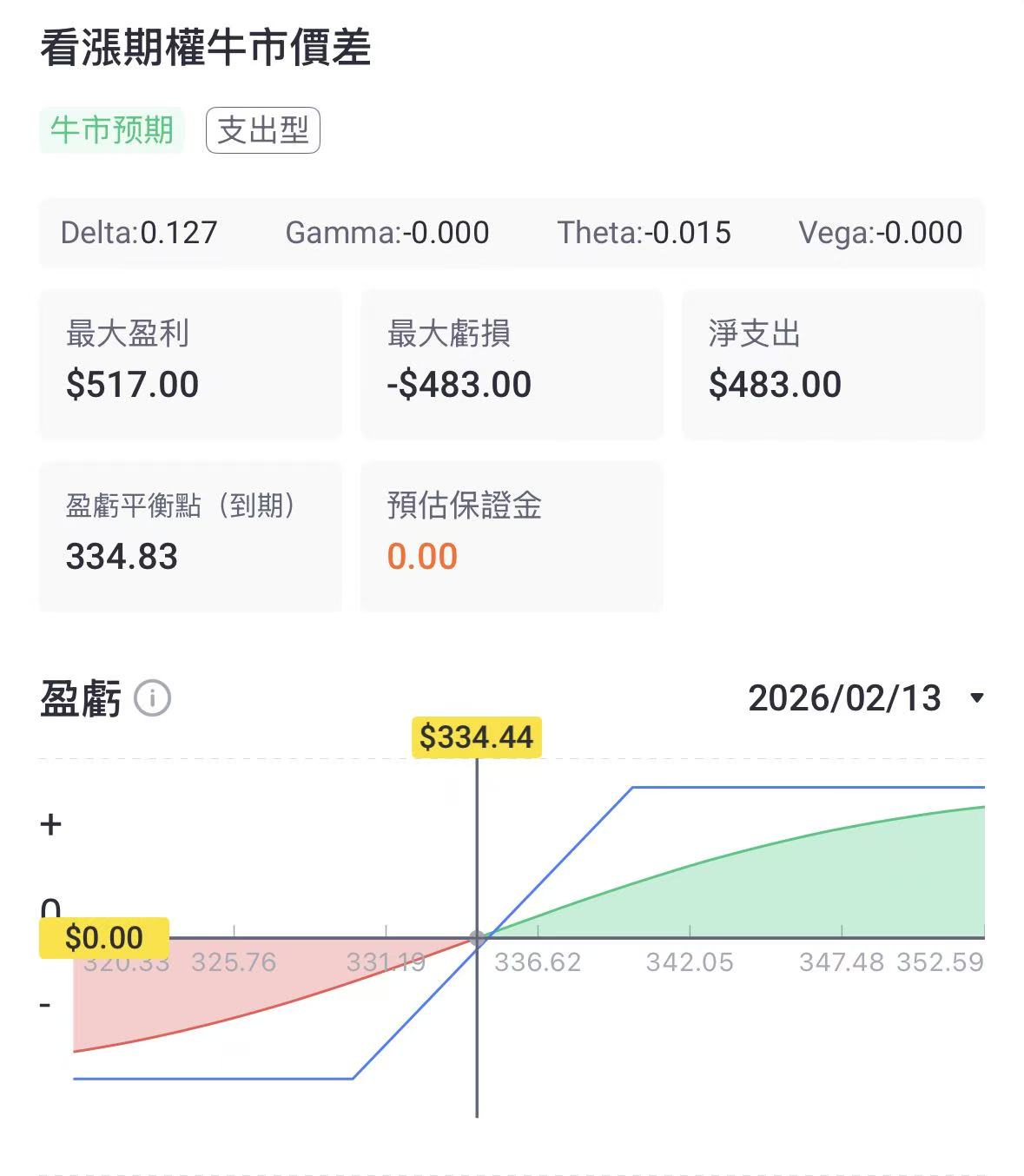 策略逻辑:在看好股价中长期前景但希望降低初始成本的背景下,该策略通过卖出更高行权价的看涨期权来抵消部分权利金支出,将收益和风险锁定在330至340美元的区间内。