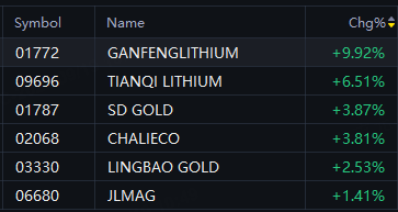 HK Non-ferrous metal mining stocks jumped. Ganfeng Lithium rose 10%; Tianqi Lithium rose 7%; Shandong Gold, CHALIECO rose 4%; Lingbao Gold rose 3%; JLMAG Rare-Earth rose 1%.