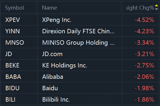 Chinese ADRs and ETFs dropped in overnight trading. XPeng fell 5%; YINN fell 4%; JD.com fell 3%; Alibaba, Baidu, and Bilibili fell 2%.