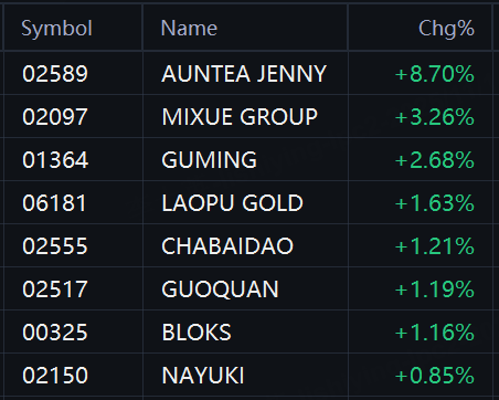 New consumer stocks gained in Hong Kong. Auntea Jenny rose 9%; Mixue Group and Guming rose 3%; Laopu Gold rose 2%; Cha Baidao, Guoquan, Bloks rose 1%.