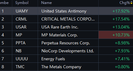 UAMY and CRML Rose 18%; USAR Up 13%; MP Up 11%; PPTA Up 9%; NB Rose 8%; UUUU Rose 7%.