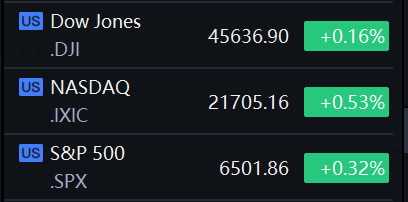 The S&P 500 climbed 0.32% to end the session at 6,501.86 points, reaching a record high close for a second straight day. The Nasdaq gained 0.53% to 21,705.16 points, while the Dow Jones Industrial Average rose 0.16% to 45,636.90 points, exceeding its previous record high close on August 22.