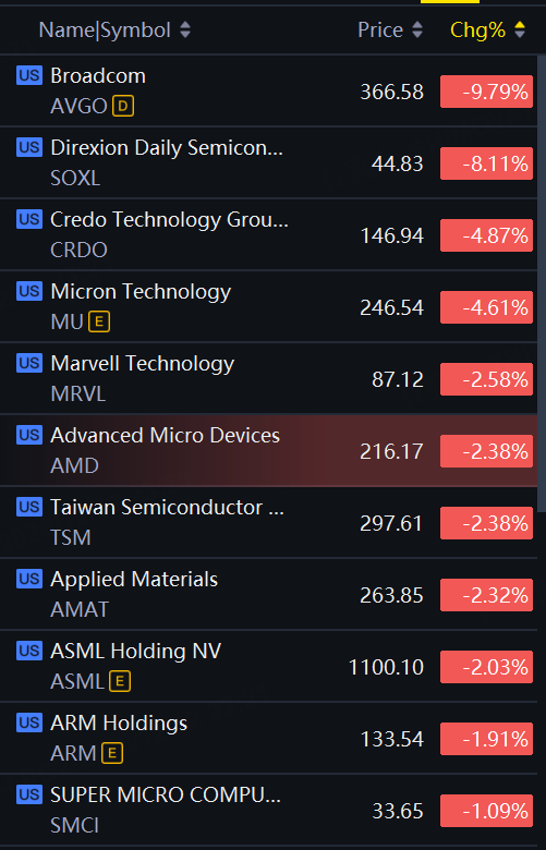 Chip stocks fell after Broadcom’s earnings result. Broadcom fell 9.8%; SOXL down 8%; Credo, Micron down over 4%; Marvell, AMD, TSMC, Applied Materials down over 2%.