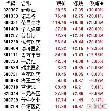 A股方面,医药赛道直接引爆涨停潮,截至发稿,新赣江、诺思格、荣昌生物、华人健康、普蕊斯、泓博医药等涨停,三元基因、仟源医药、一品红、百花医药等纷纷上涨。