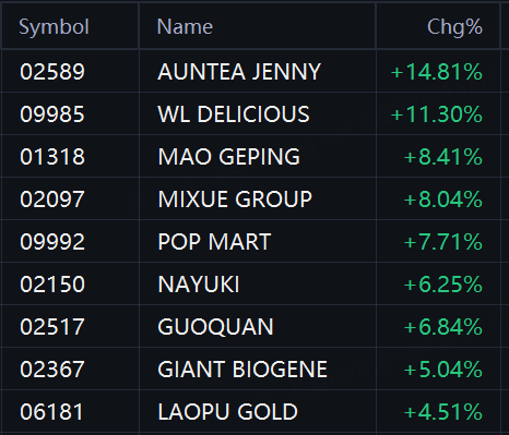 New consumer stocks surged in Hong Kong. Auntea Jenny rose 15%; Weilong Delicious rose 11%; Mao Geping, Mixue Group, and Pop Mart rose 8%; Guoquan rose 7%; Nayuki rose 6%; Giant Biogen and Laopu Gold rose 5%.