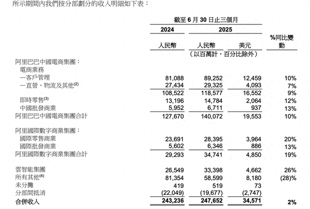 2026财年第一财季,阿里巴巴营收2476.5亿元人民币,同比增长2%,若不考虑高鑫零售等已出售业务,同比增长10%。报告期内,阿里经营利润为349.88亿元(48.84亿美元),同比下降3%,主要是由于经调整EBITA的减少所致。归属于普通股股东的净利润为人民币431.16亿元(60.19亿美元)。净利润为人民币423.82亿元(59.16亿美元),同比增长76%。