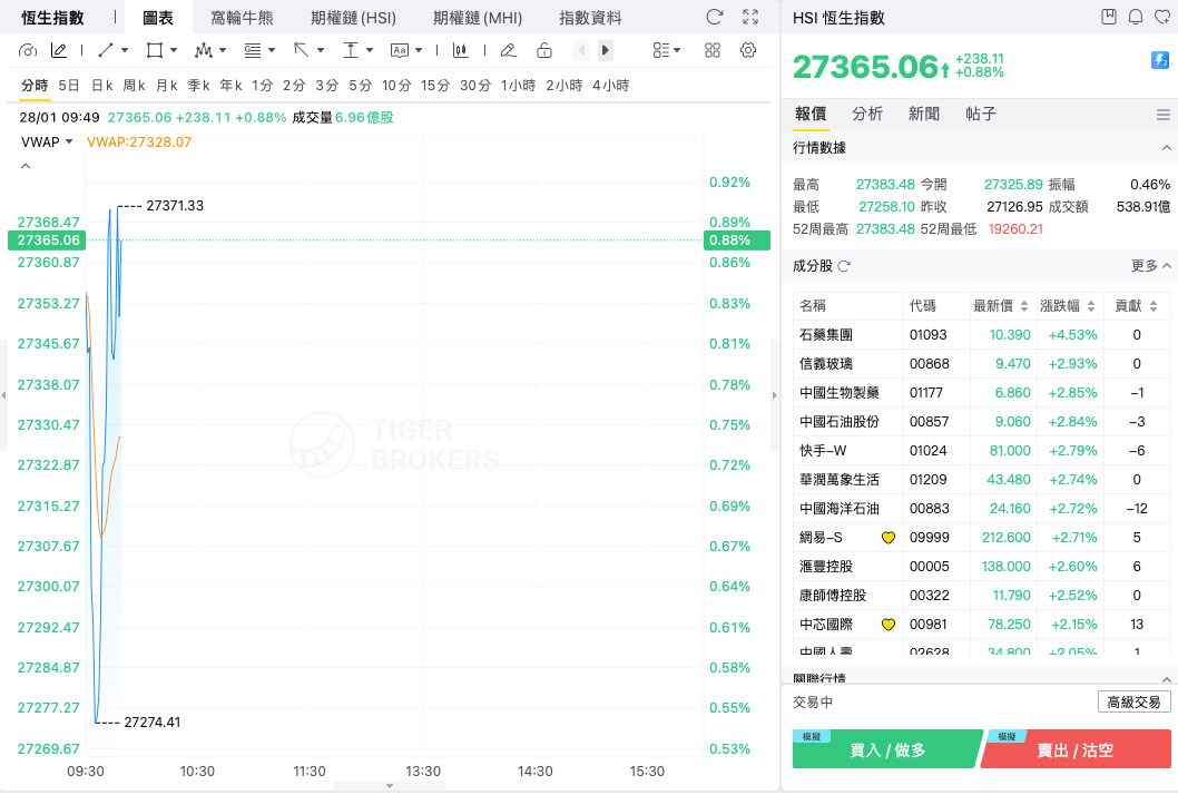 恒生指数盘中升至27374点,创2021年7月以来新高。