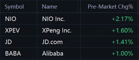 Some Chinese ADRs gained in premarket trading on Friday. NIO and XPeng rose 2%; JD.com and Alibaba rose 1%.