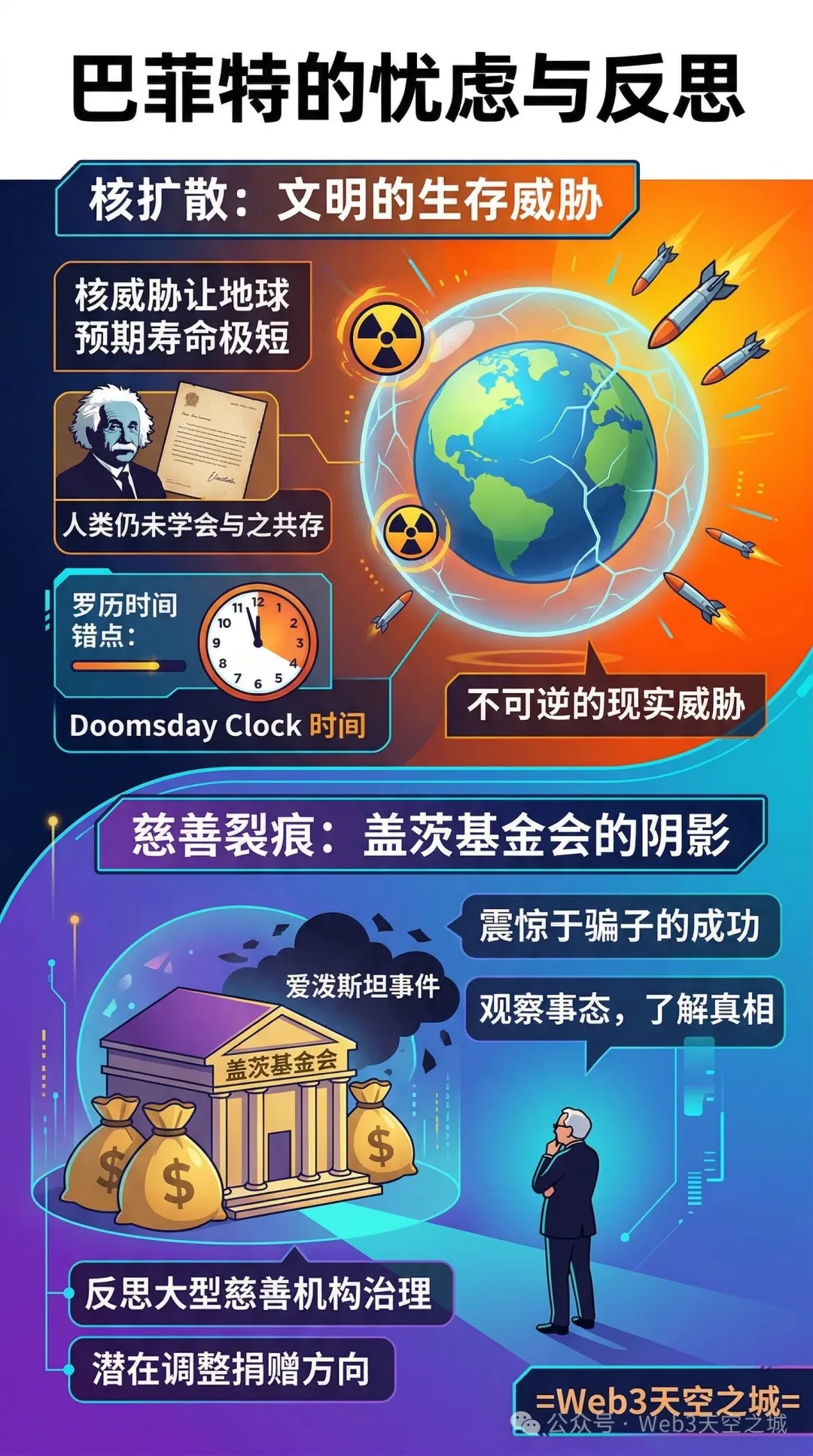 “我上小学时,他们说太阳将在45亿年后燃尽;而现在,核威胁让地球的预期寿命变得极短,”巴菲特严肃地指出,伊朗、朝鲜等国的核野心让世界处于极度不稳定的边缘。他转述了一位前总统的担忧:如果导弹已经在空中,总统只有10分钟的时间决定是否发动“相互保证毁灭”的反击。巴菲特认为,“核武器是人类面临的最大现实威胁,而这个威胁是不可逆的。”
