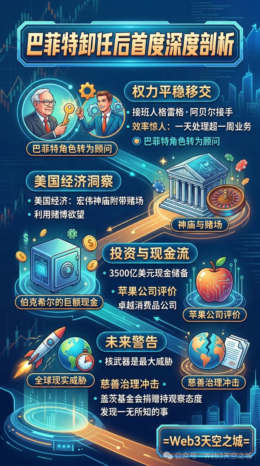 本次访谈不仅揭秘了伯克希尔高达3500亿美元现金储备背后的逻辑,还首次深入触及了近期围绕比尔·盖茨与爱泼斯坦(Jeffrey Epstein)档案的争议对全球慈善事业的冲击。巴菲特不仅是一个投资家,更像是一位站在时代高处的观察者,他将美国经济形容为一座“附带赌场的宏伟神庙”,并对核威胁、银行脆弱性以及慈善治理的未来提出了严峻警告。