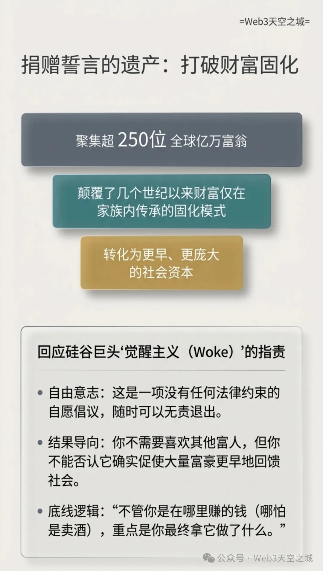 贝基·奎克: 最近有一些文章报道了某些领域的反弹,特别是科技界的亿万富翁,比如 Peter Thiel 和 Mark Andreessen,他们表示不喜欢 Giving Pledge,并认为这是“觉醒文化”(woke)。