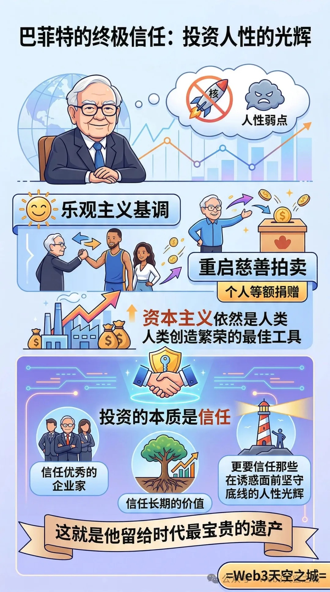 尽管存在对核威胁和人性弱点的隐忧,巴菲特在访谈结束时依然回归了他的乐观主义基调。他宣布将与斯蒂芬·库里夫妇合作重启慈善拍卖,并将个人出资进行等额捐赠。在他看来,资本主义虽有瑕疵,但依然是人类创造繁荣的最佳工具。