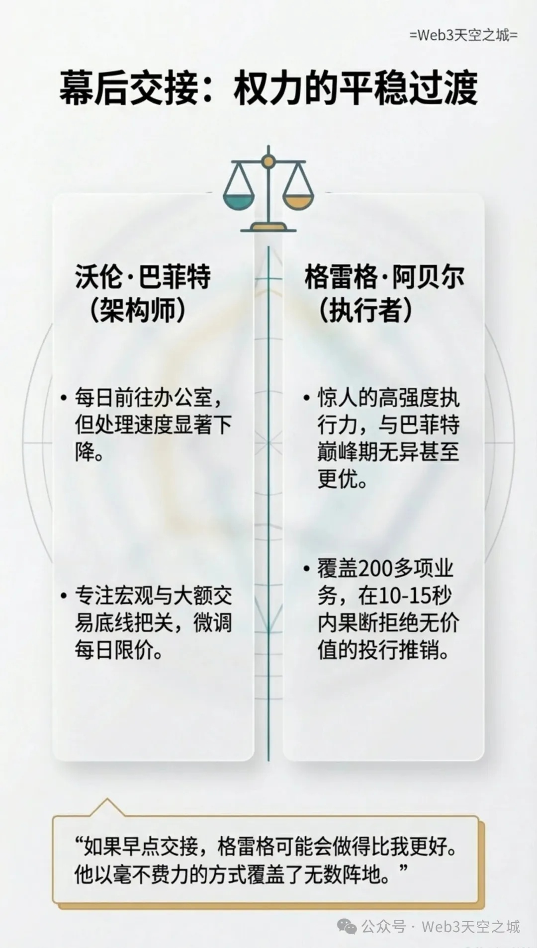 “格雷格·阿贝尔(Greg Abel)如今接手了一切,他在一天内处理的业务范围比我巅峰时期一周还要多。我本可以更早放手。”