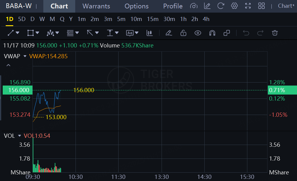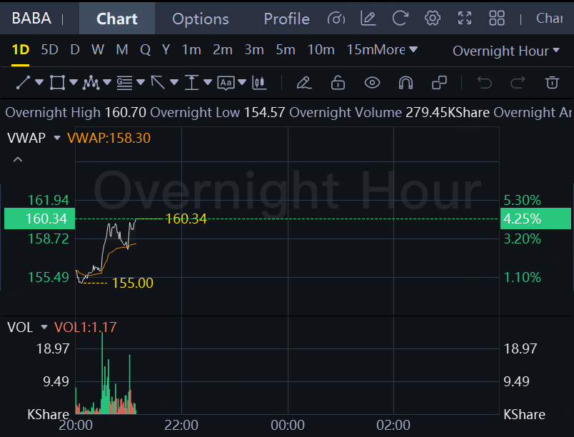 Alibaba’s U.S.-listed shares up 4% in overnight trading while HK-listed shares turned positive and last up 0.7%.