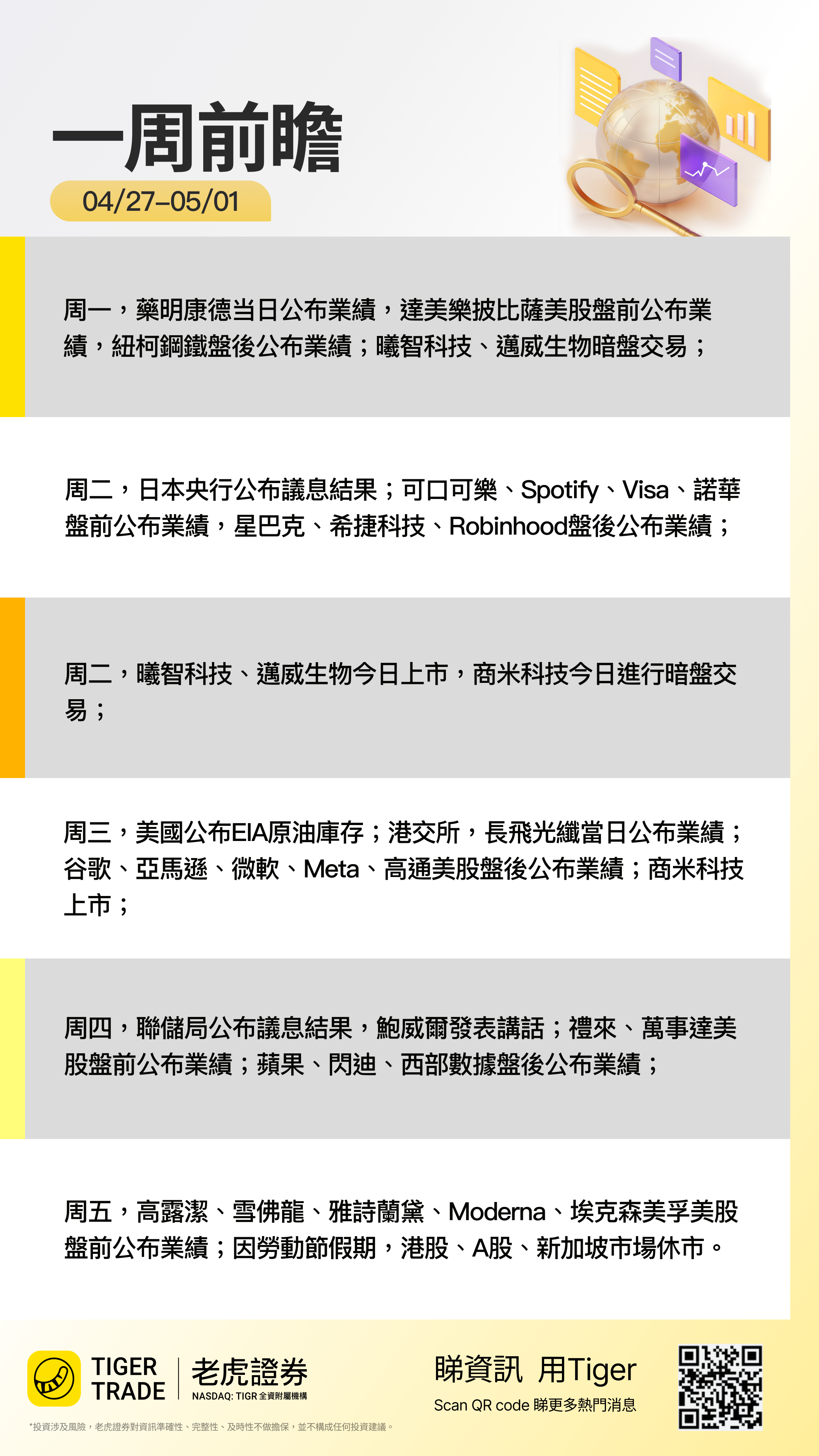 业绩:诺华、康宁、英国石油、可口可乐、Spotify、通用汽车、联合包裹、捷蓝航空、巴克莱银行(盘前),Visa、恩智浦、星巴克、希捷科技、淡水河谷、Robinhood、Bloom Energy、Booking Holdings(盘后)发布财报;港股中国平安、中国太保、招商银行、奇瑞汽车、比亚迪股份、中广核电力、中国海洋石油、中国石油化工股份发布财报。