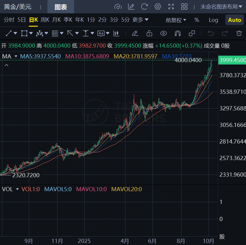 10月8日,现货黄金站上4000美元整数关口,再创历史新高,今年迄今已累涨近1400美元,涨幅超52%。