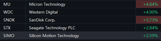 Storage shares jumped in Tuesday trading. Western Digital, Micron up 5%; SanDisk up 4%; Seagate, Silicon Motion up 3%.