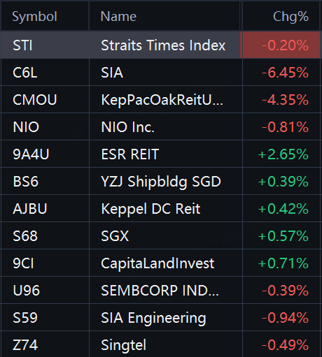 Singapore stocks opened lower on Tuesday. STI fell 0.2%; SIA fell 7%; Keppel Pacific Oak US Reit fell 4%; ESR-Reit rose 3%.