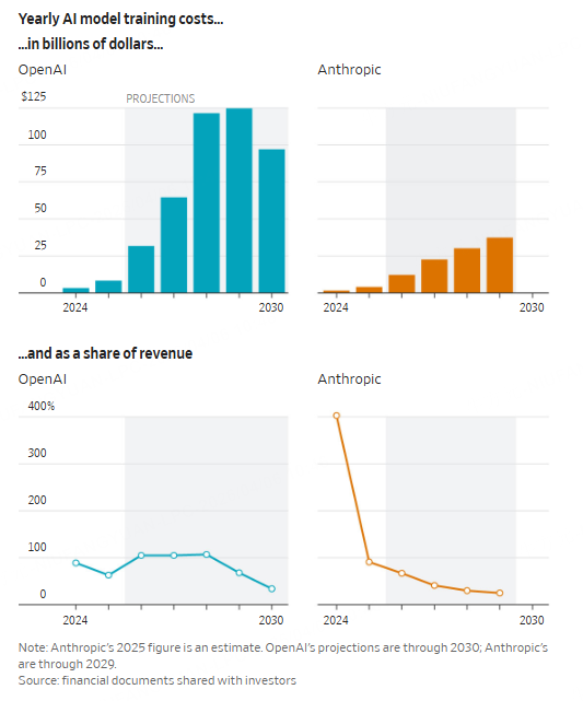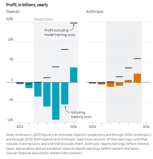 Strip out “compute for research,” and OpenAI is actually on track to turn a small pretax operating profit this year, as is Anthropic under its best-case scenario. Add it back in, and OpenAI doesn’t expect to break even until the 2030s. Anthropic forecasts reaching that milestone sooner.