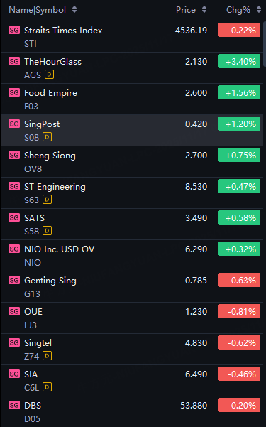 Singapore stocks opened lower on Monday. STI fell 0.2%; TheHourGlass rose 3%; SingPost rose 1%.