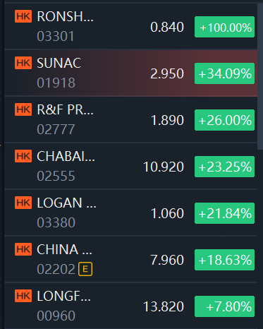 Ronshine China rose 100%; Sunac China rose 34%; R&F Properties rose 26%; Logan Group rose 22%; China Vanke rose 19%; Longfor Group rose 8%.