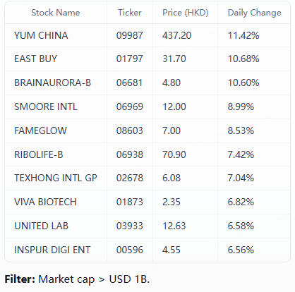 III. Top 10 Gainers in Hong Kong Market Today