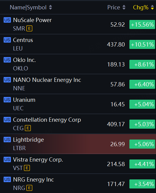 Nuclear stocks jumped in premarket trading. Nuscale Power up 16%; Centrus up 11%; Oklo up 9%; NANO Nuclear Energy up 6%; CEG, Uranium up 5%.
