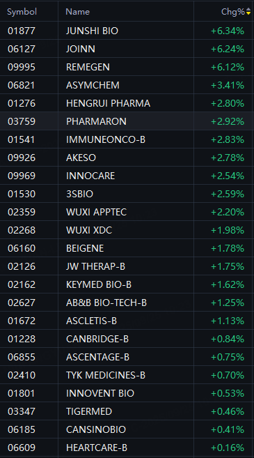 Junshi Bio, JOINN, RemeGen rose 6%; Asymchem, Hengrui Pharma rose 3%; Wuxi Apptec rose 2%.