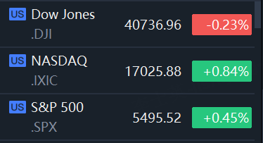 The Dow Jones Industrial Average fell 92.63 points, or 0.23%, to 40,736.96, the S&P 500 gained 24.47 points, or 0.45%, to 5,495.52 and the Nasdaq Composite gained 141.28 points, or 0.84%, to 17,025.88.