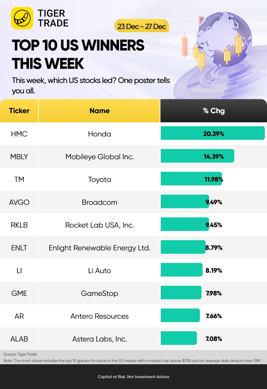 以下是截至12月27日的一周内,市值超过100亿美元的标普500指数成分股涨幅榜前十名: