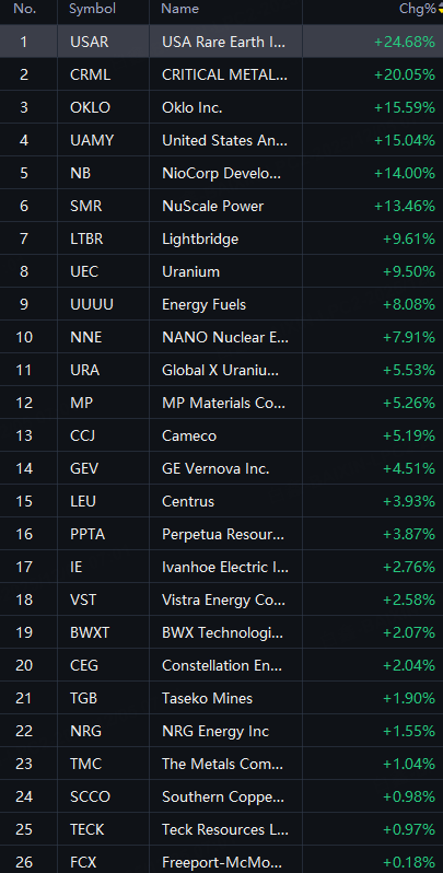 Critical minerals companies shares shined. USAR and CRML up 20%; OKLO and UAMY up 15%; NB and SMR up 10%; LTBR and UEC up 9%.