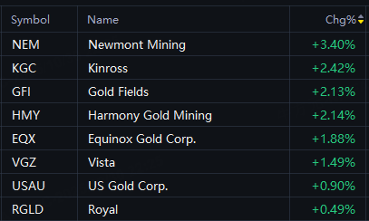 Newmont up 3%; Kinross, Gold Fields, Harmony Gold, Equinox up 2%; U.S. Gold up 1%.